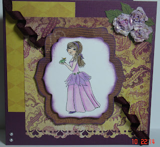 This card was made with an Inkadinkado set, some Sakura stardust pens, Copics, nesties, flowers, brads, rhinestones. Not sure if this paper is BoBunny?